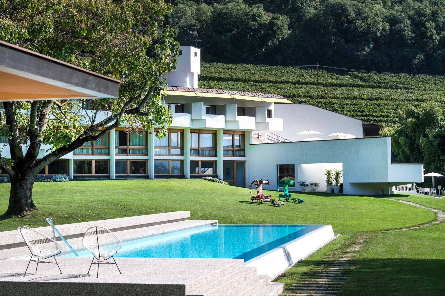 Am Nordufer des Kalterer Sees erhebt sich das Seehotel Ambach – ein architektonisches Juwel der 1970er-Jahre, entworfen von Othmar Barth. Zeitlose Designobjekte fügen sich harmonisch in das reduzierte Interieur ein und schaffen eine stilvolle Atmosphäre mit Blick auf den See. Die 28 Zimmer und vier Suiten öffnen sich zur Gartenanlage, wo der beheizte Outdoorpool und ein Privatstrand mit Badestegen zu erfrischenden Momenten einladen. Auf der Seeterrasse beginnt der Tag mit einem reichhaltigen Frühstück, abends begeistert Albin Widmanns Küche mit mediterraner Raffinesse. Im Sommer finden Yoga- und Pilatesstunden am Wasser statt.