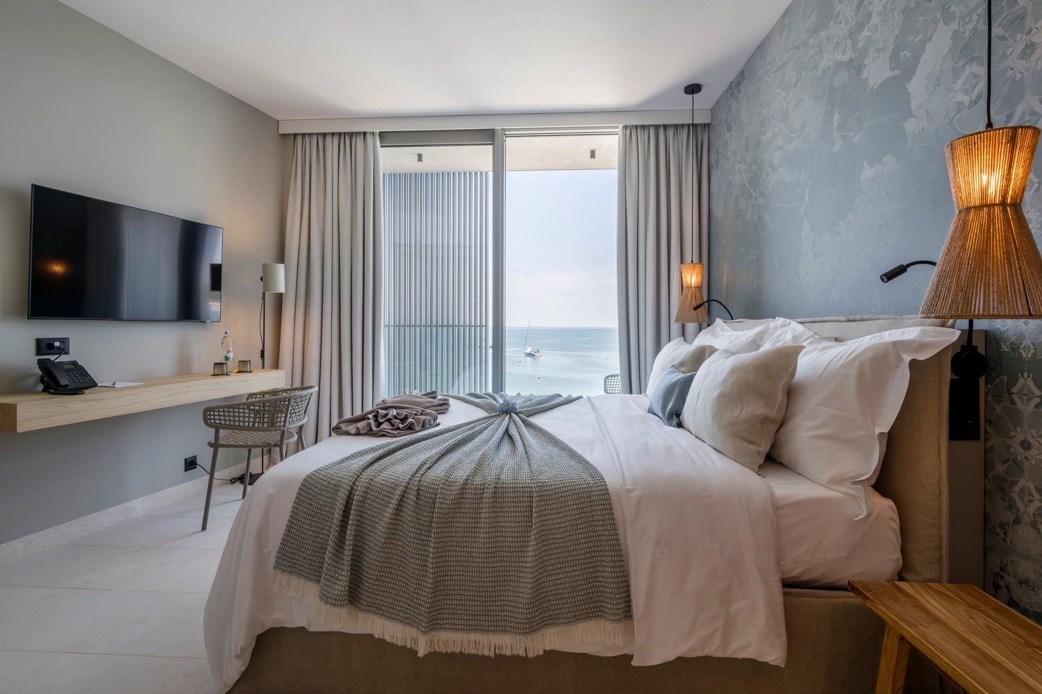 Im Inneren des Hotels, das zur schweizer Hotelgruppe „Cachet Hotel Collection“ zählt, dominiert ein moderner, puristischer Stil mit Pastellfarben und abgestimmtem Mobiliar. Das Design zieht sich durch das ganze Haus – von den Zimmern bis hin zur Penthouse-Suite, die über eine weitläufige Terrasse verfügt. Letztere dient an ausgewählten Abenden als Sunset-Bar.