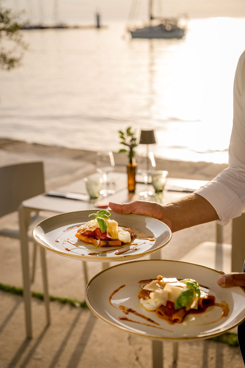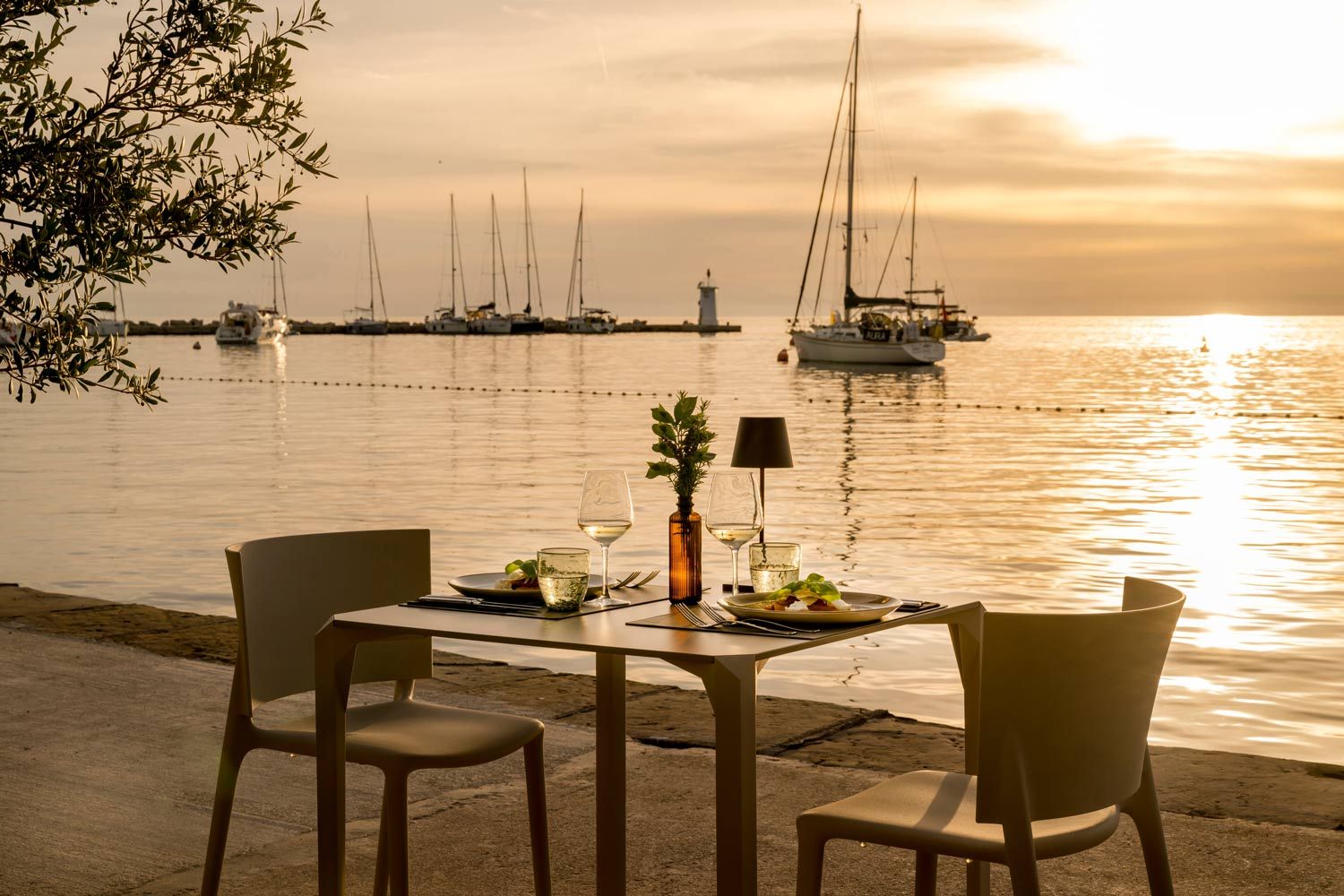 Sollte die Suite belegt sein, bietet das hauseigene Restaurant Porporela einen genauso malerischen Ausblick auf den Horizont. Hierfür ist Küchenchef Stefano Cosattini verantwortlich. Der erfahrene Koch setzt auf den Produktreichtum der Adria-Halbinsel und kocht mit einer istrianischen und italienischen Handschrift. Neben Frühstück und Lunch gibt es abends bodenständige und dennoch raffinierte Gerichte wie gegrillten Oktopus (27 Euro), marinierte rote Garnelen (19 Euro) und Pasta Cacio e Pepe (17 Euro). Ins Glas kommen internationale Weine wie auch Spannendes aus Kroatien.
