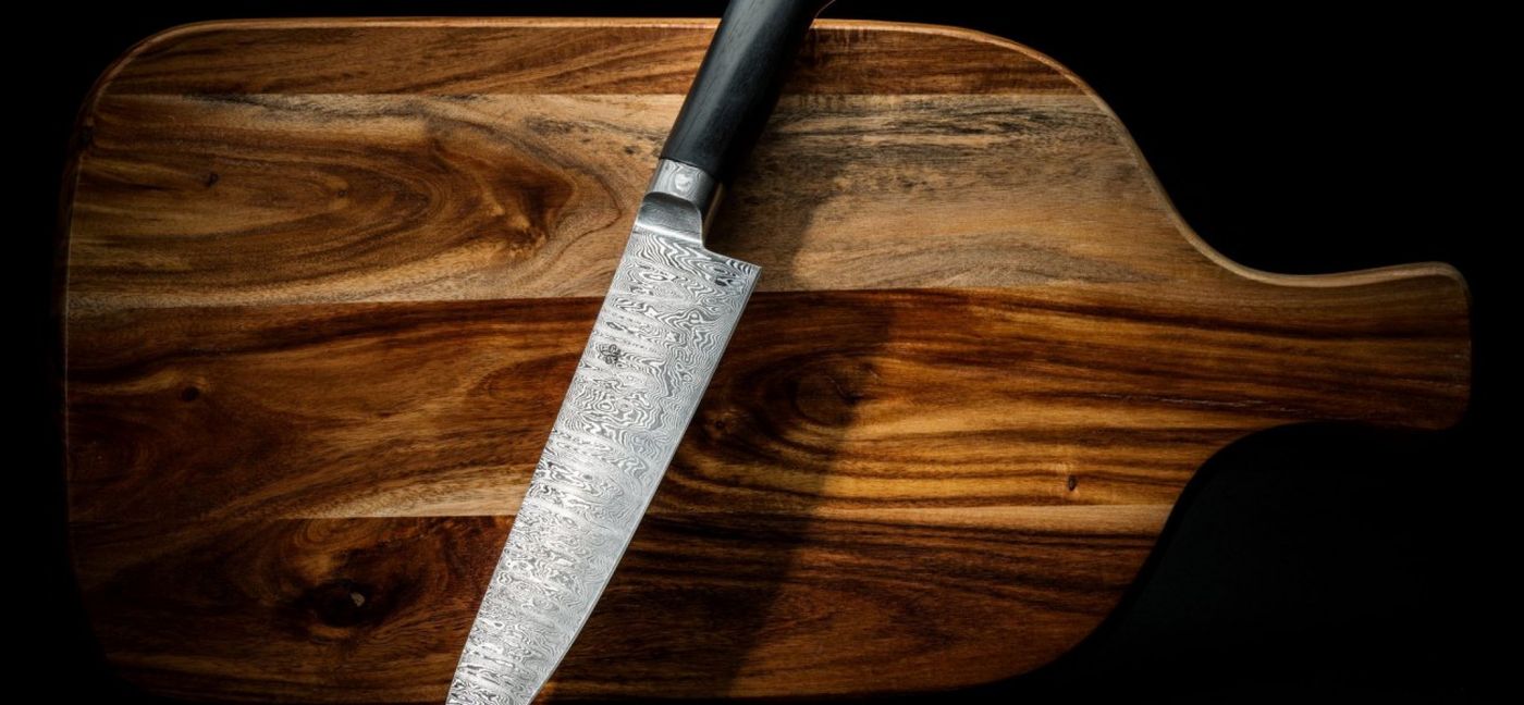 Das ist eine gute Frage! Ich würde sagen ein 210 mm Gyuto (japanisches Chefmesser). Geschmiedet in der Integraltechnik aus Damaststahl, in 220 Lagen hochkant gefaltet und mit 63,64 HRC Härte. Der Griff ist aus australischem Totholz aus der Wüste, einem der härtesten Hölzer der Welt – das ist so feinporig, da braucht man eigentlich kein Öl mehr für die Politur. Das ist mein ganz persönlicher Geschmack.
