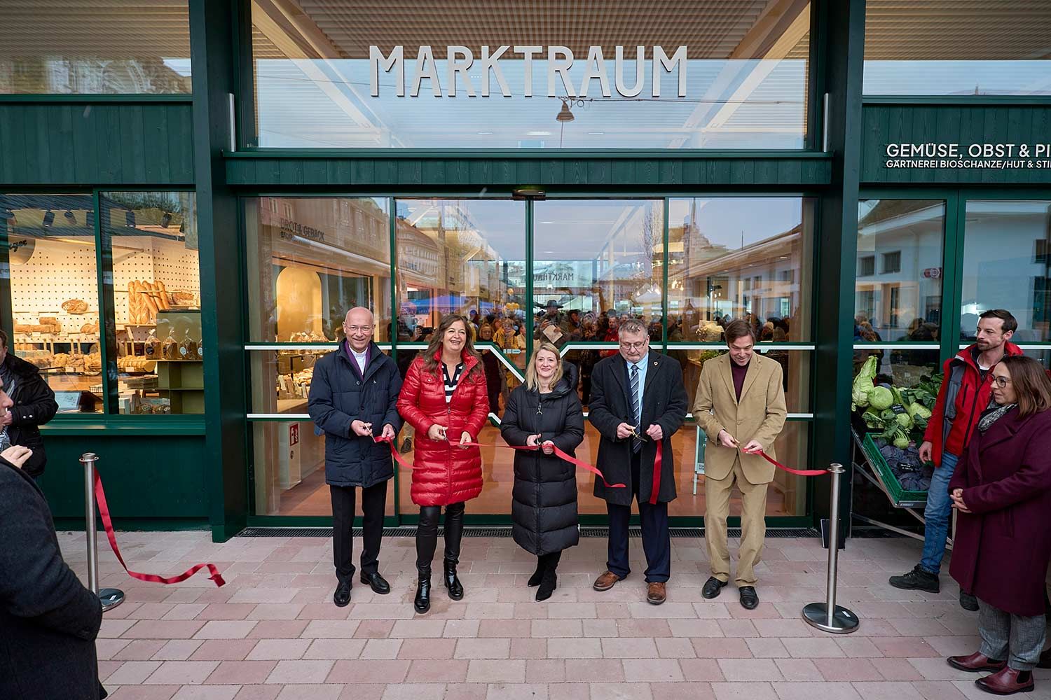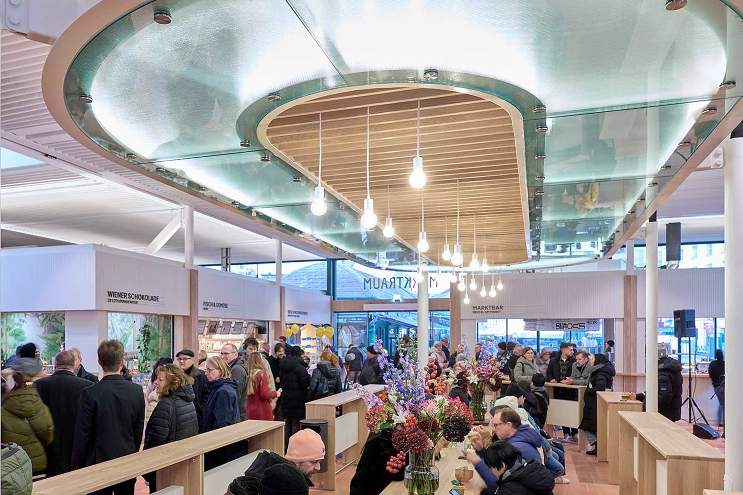 13 Marktstände finden im neuen, wetterfesten Marktraum Platz, inklusive der Schauküche „Markträumchen“ mit einem begehbaren Dachgarten.