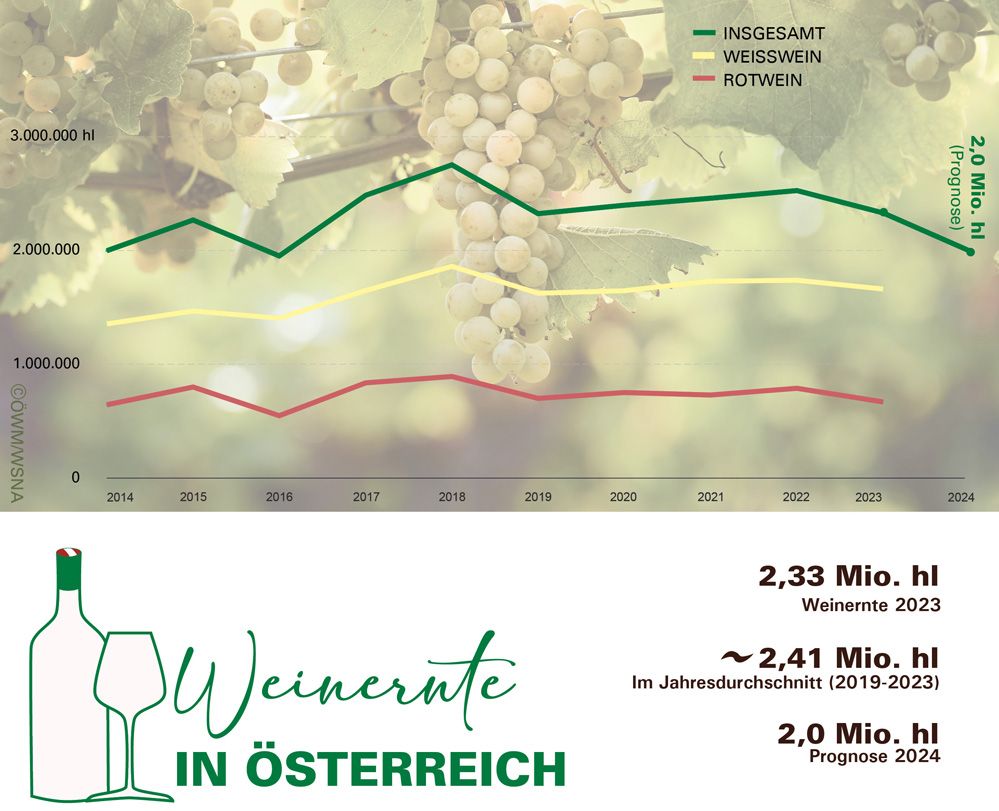 Die Hitzeperioden und der zeitige Austrieb der Reben riefen heuer die meisten Winzer*innen besonders früh zur Weinlese. Das Fachmagazin „Vinaria“ berichtete gar von der „frühesten Lese seit fast 50 Jahren“. Grund dafür sind schwankende Wetterbedingungen, die das Weinjahr 2024 prägen und schließlich zu einem geringeren Ertrag führen. „Die erwartete Weinmenge wird mit etwa 2 Millionen Hektoliter doch deutlich unter dem Durchschnitt der letzten Jahre liegen“, sagt Johannes Schmuckenschlager, Präsident des Österreichischen Weinbauverbandes. Im vergangenen Jahr betrug die erzeugte Menge 2,33 Millionen Hektoliter. Weinfreund*innen dürfen dennoch aufatmen, denn der Jahrgang verspreche, ein sehr guter zu werden, wie Schmuckenschlager betont: „Wir können uns auf einen reifen, harmonischen Weinjahrgang freuen, der punktuell vielleicht auch etwas kräftiger ausfallen wird.“