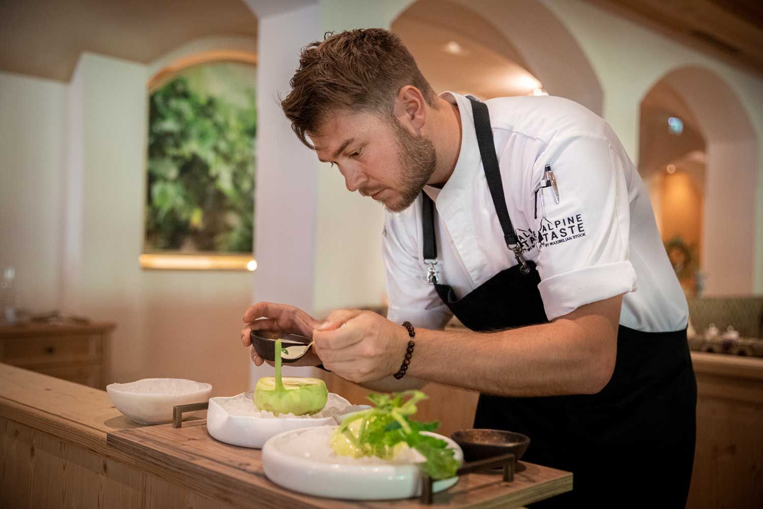 Regionalen und kreativen Genuss für alle Sinne verspricht die exzellente und ausgezeichnete Küche im Alpenhof. Dank der Genießerpension schlemmt es sich hier von morgens am leckeren Frühstücksbüfett bis abends bei fünf-gängigen Gourmetmenüs. Küchenchef Maximilian Stock überrascht mit kreativen Geschmackskompositionen, die Innovation und Regionales zu kulinarischen Höchstleistungen vereinen. „Alpine Taste“ nennt er seine Genusswelt und legt dabei größten Wert auf saisonale und regionale Produkte, die von heimischen Lieferant*innen – oder vom eigenen Bauernhof in Obsteig – bezogen werden. Ausgezeichnet mit 15 Gault&Millau-Punkten und somit drei Hauben ist das Restaurant eine vielversprechende Adresse für Genießer*innen.