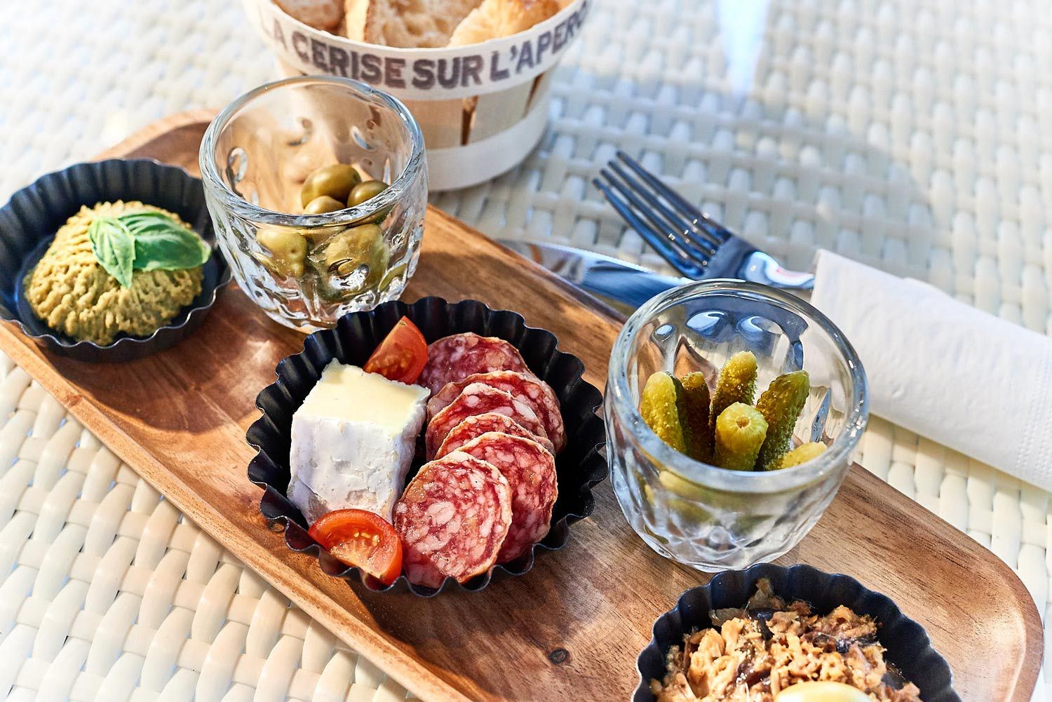 Im angeschlossenen Bistrobereich stehen klassische französische Speisen auf der Karte: Neben Croissants, Baguettes und Frühstücksvariationen werden von Dienstag bis Samstag frisch zubereitete Crêpes, bretonische Galettes, Quiches sowie süße und pikante Tartes serviert. Ergänzt wird das Angebot durch französische Feinkost wie Tapenade, Rillettes oder Madeleines, die auch zum Mitnehmen erhältlich sind.