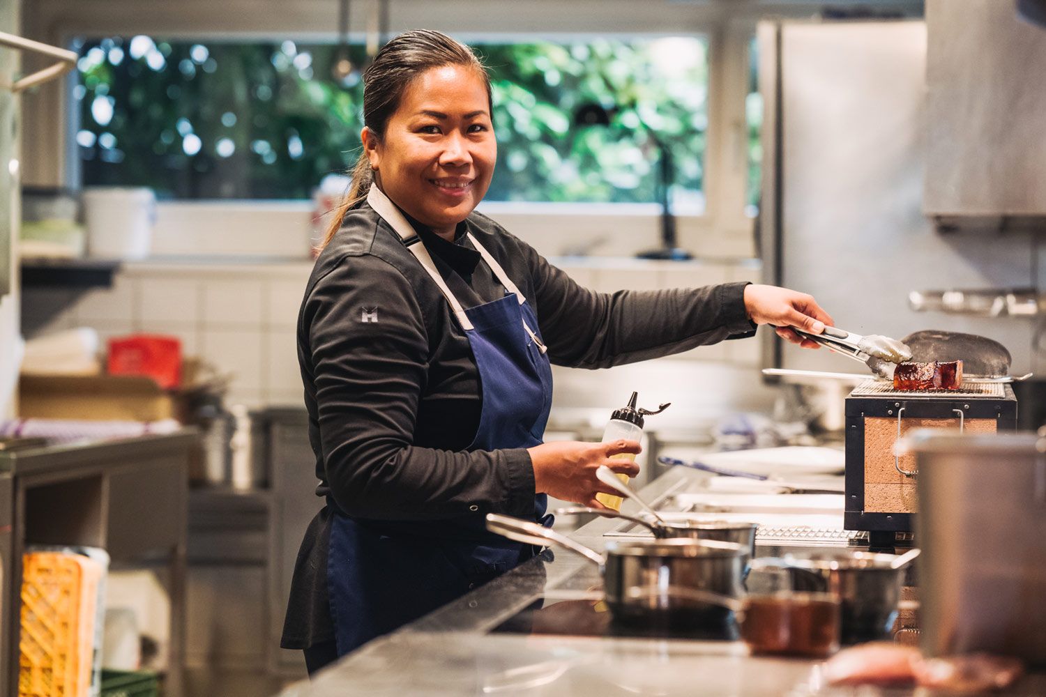 So entstand das Ibon. Der Name kommt aus dem Philippinischen, steht für „Vogel“ und soll eine „Hommage an die kulinarische Freiheit“ sein. Rose Molina Gehrer, gebürtig aus den Philippinen, ist Küchenchefin beider Betriebe und konzipiert die Menüs. Wie bereits im Küchentanz spielen auch im Ibon südostasiatische Aromen eine prägende Rolle, ohne dass sich die Küche klar festlegen möchte. „Unsere Gerichte verfolgen einen Crossover-Ansatz mit Geschmäckern unterschiedlicher Länder“, ergänzt Gehrer.