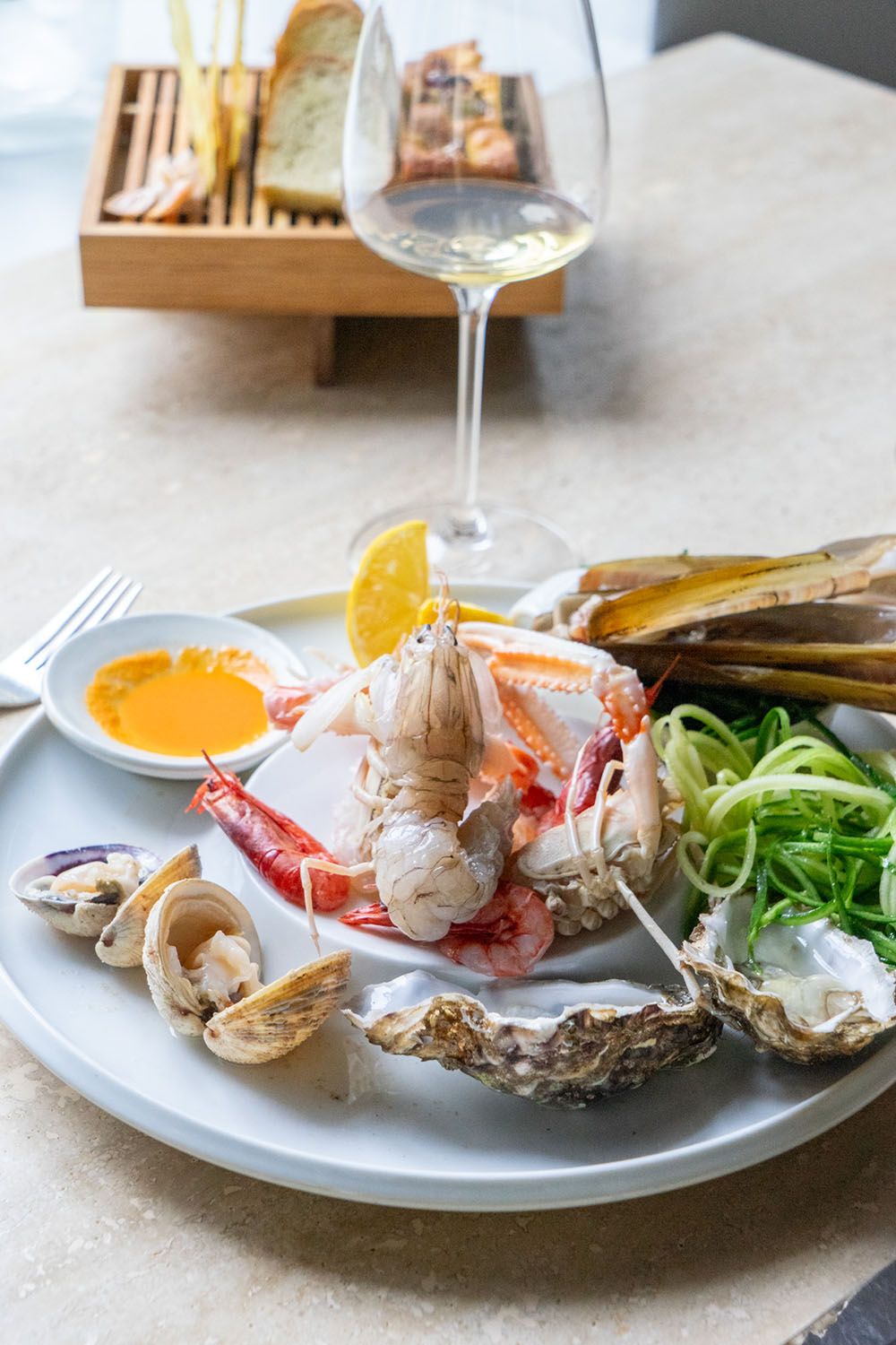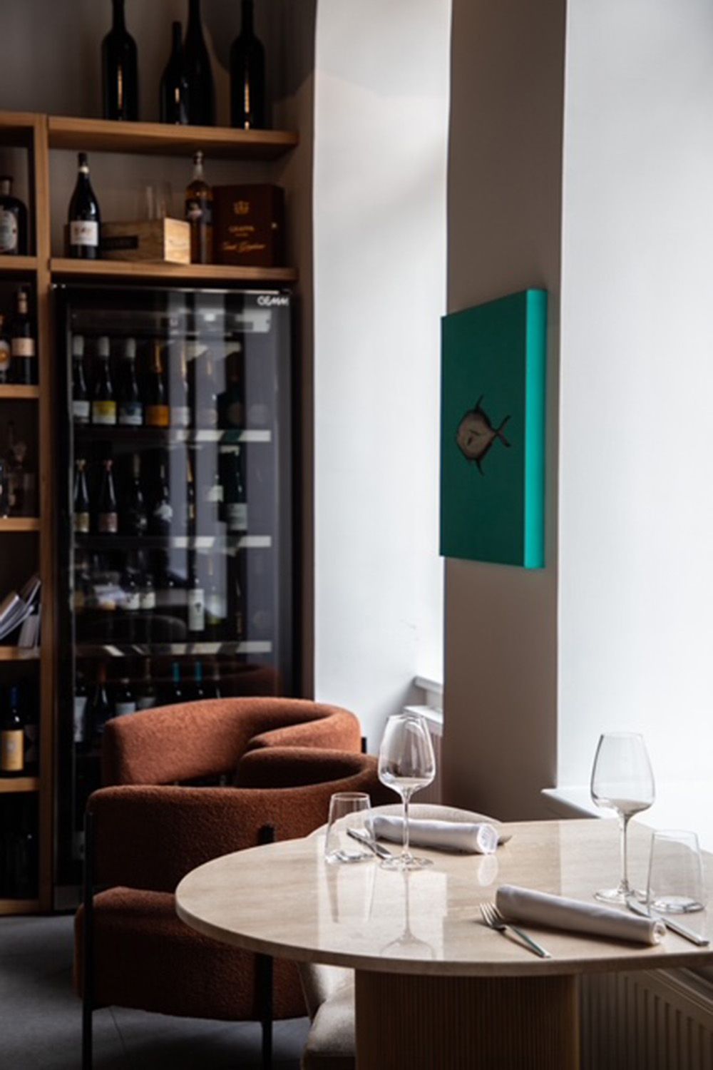 Das Restaurant bietet ein elegantes, fast intimes Setting. An den Marmortischen finden etwa 40 Gäste Platz, die mit Blick auf das gut gefüllte Weinkabinett und die charmanten Fisch-Illustrationen an den Wänden speisen. Auf der Karte lesen sich Gerichte wie das warme „Gragnano“-Panuozzo mit Büffelbutter und Sardellen (10,50 Euro) oder die Rotbarbe nach Parmigiana-Art (18,50 Euro). Wer Fisch in seiner reinsten Form mag, greift zum Rohfisch aus der Adria mit Amalfi-Zitrone (29 Euro) oder den Scialatielli mit Meeresfrüchten und Friarielli (26,50 Euro als Hauptspeise). Auch ein gegrillter Oktopus mit geräuchertem Scamorza (26,50 Euro) findet sich unter den Hauptgängen.