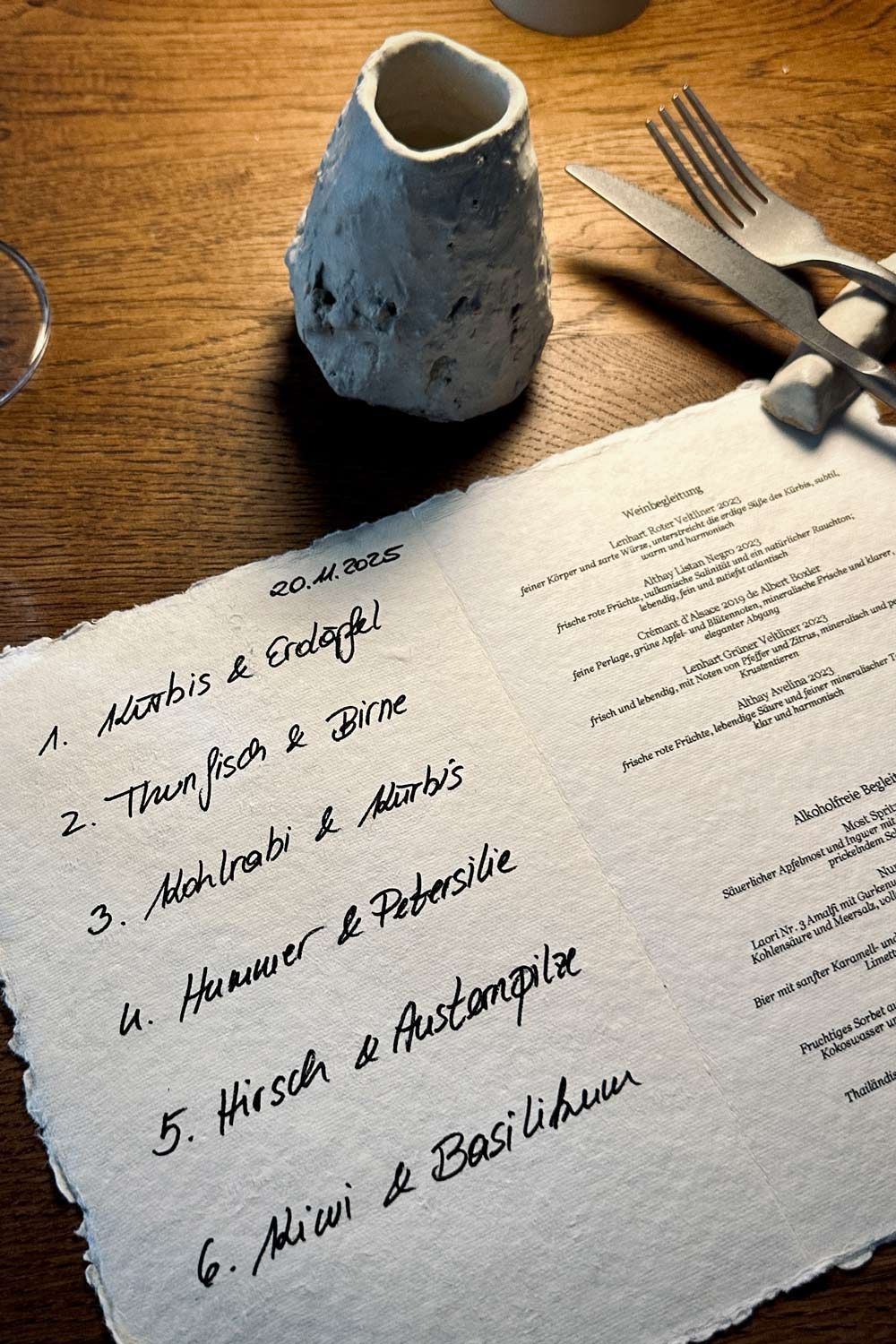 Eröffnet wurde am 21. November nach einigen Renovierungsarbeiten, seither erwartet Gäste von Donnerstag bis Samstag ein sechsgängiges Menü (145 Euro), dessen genaue Ausführung erst am Tisch offenbart wird. Auf der handgeschriebenen Karte erfährt man lediglich die dafür verwendeten Produkte. „Mehr Informationen geben wir bewusst nicht, die Gäste sollen von jedem Gang überrascht werden“, sagt der Küchenchef im Gespräch mit Gault&Millau. „Kürbis & Erdäpfel“ oder „Thunfisch & Birne“ kann beispielweise als Auskunft zu den jewiligen Gängen entnommen werden. Damit steht jedoch ohnehin das im Vordergrund, das der Koch als wichtigstes ansieht: „Ich koche produktfokussiert und versuche die einzelnen Zutaten in seiner Gesamtheit zu nutzen.“