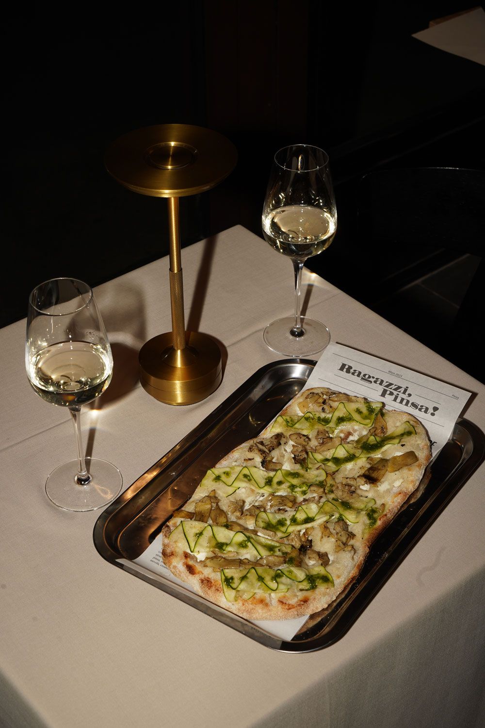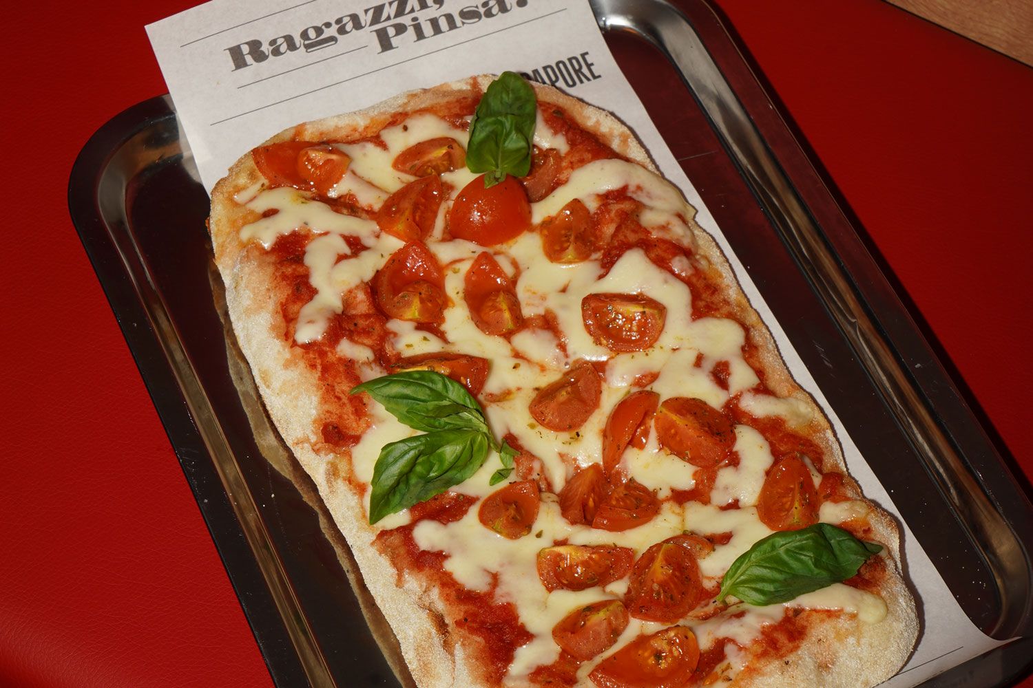 Aber nun zum Wesentlichen: Gesetzt wird auf Produkte aus Italien sowie auf Hausgemachtes und Selbsteingelegtes. Neben Vorspeisen wie Stracciatella di Bufala mit Tomatenmarmelade (9 Euro) gibt es eine große Bandbreite an Pinsa-Variationen, sowohl mit als auch ohne Tomatensauce: Von der klassischen Variante mit Mozzarella di Bufala und marinierten Cherrytomaten (12 Euro) über eine mit Mortadella, Trüffelcreme und Pistazien (19 Euro) bis hin zu einer Pinsa mit Birne, Gorgonzola, Pinienkernen und Honig (17 Euro). Süß wird es mit Maritozzi (3 Euro), einem italienischem Hefegebäck, Cannoli (6 Euro) und Tiramisu (7 Euro).