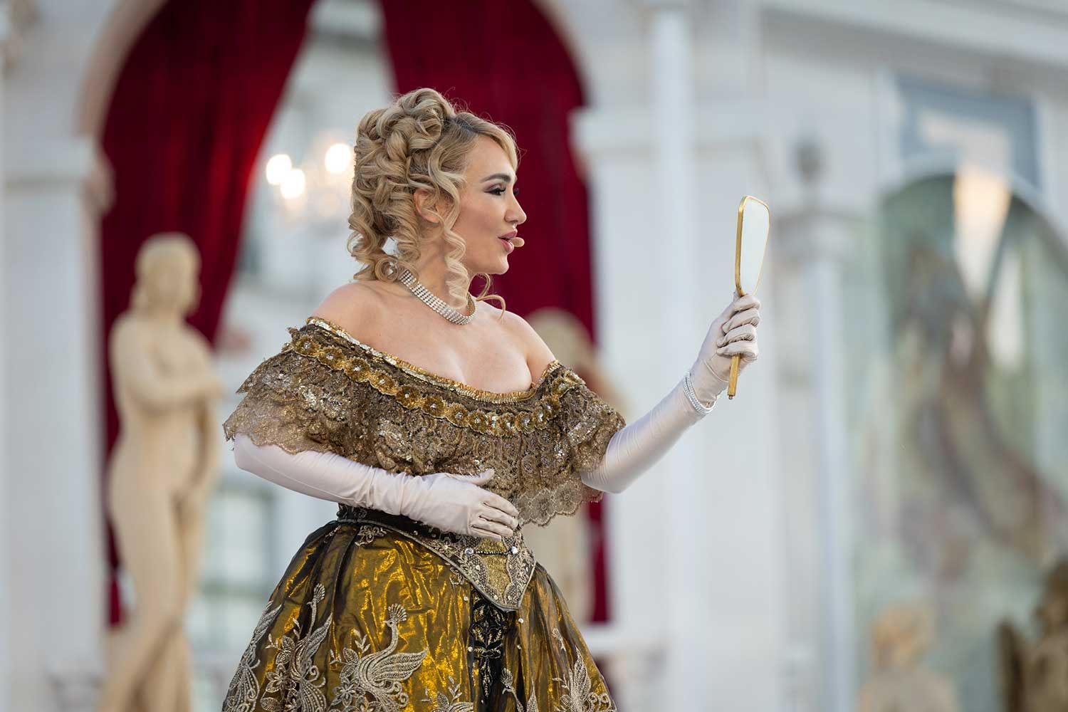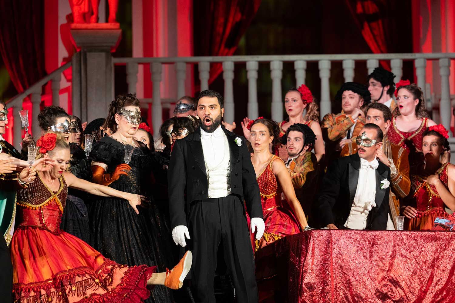 Giuseppe Verdis Meisterwerk La Traviata wird im diesjährigen Wiener Opernsommer mit hochkarätigen Akteur:innen unter der Schirmherrschaft von Bürgermeister Michael Ludwig effektvoll aufgeführt. Erstmals findet der Opernsommer am Heumarkt statt, wo im Winter Eis gelaufen wird. Die eigens errichtete Open-Air-Bühne bietet optimale Sichtverhältnisse, und ein prominent platziertes Orchester sorgt für ein unmittelbares Musikerlebnis. Ein besonderes Highlight ist die künstlerische Einbindung der Fassade des Wiener Konzerthauses, die als Projektionsfläche dient. Die Premiere am 1. Juli war ein durchschlagender Erfolg, und bis 19. Juli hat man noch an mehreren Terminen die Möglichkeit, Oper auf höchstem Niveau in anregendem Freiluft-Ambiente zu genießen.