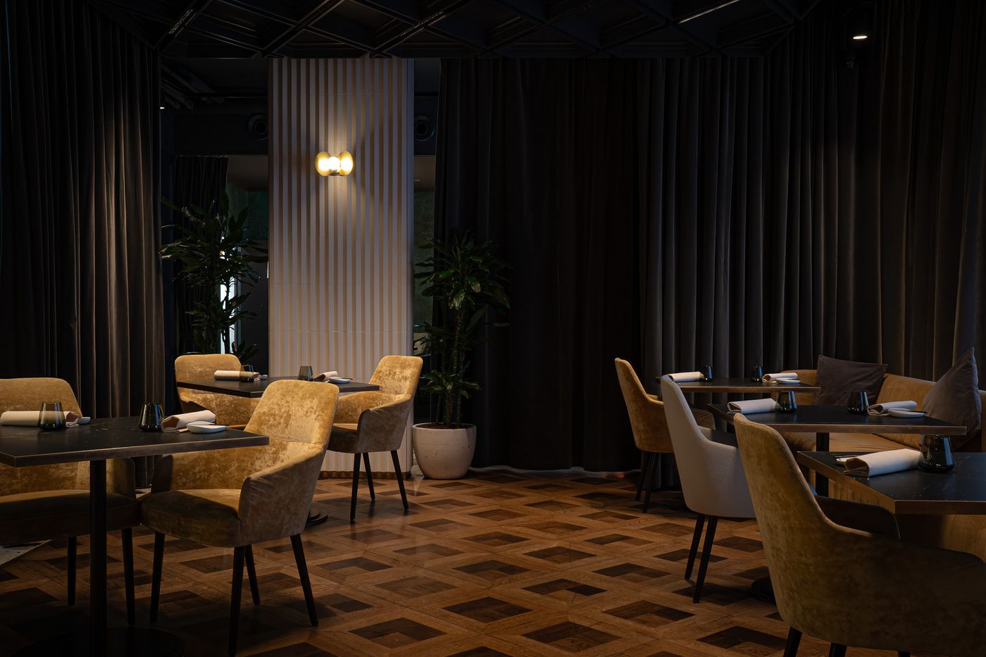 Am Tisch angekommen, wird man mit kleinen Happen begrüßt. Hier sticht besonders die Morchel mit den Erbsen heraus – ein perfekter Bissen. Die Erdigkeit der Morchel, die Frische der Erbsen und die Säure des Suds harmonieren erstklassig. So kann es weitergehen. Tut es auch. Zum Beispiel der perfekt gegrillte Langostino mit Kokosnuss, Curry und Fenchel – und das alles umrahmt von einem von Umami dominierten Tom-Kha-Gung-Sud. Ein weiteres Highlight ist der Kalbstafelspitz mit Kraut, Kalbskopf und Gulaschsaftl. Was auf den ersten Blick eher banal klingt, ist eine wirkliche Wucht. Der Tafelspitz perfekt gegart, das geschmorte Spitzkraut sehr fein abgeschmeckt und dann dazu dieses intensive, klassische und in Perfektion dazu gereichte Gulaschsaftl. Da kann der Schokoladen-Rehrücken nicht ganz mithalten. Der Kuchen ist trocken und das ganze Gericht geschmacklich etwas eindimensional. Trotzdem: Die Saucen und Sude haben eine unglaubliche Komplexität und Geschmackstiefe. Weiter so.