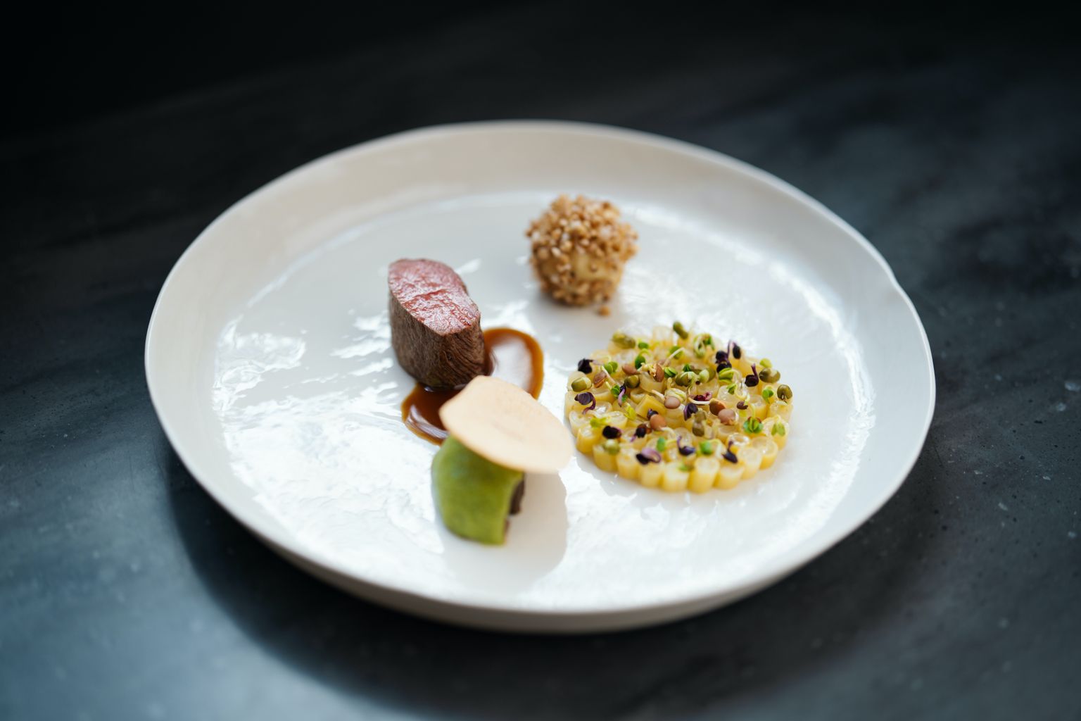 Hoch lebe die kulinarische Poesie! Das Menü heißt bei Manuel Ressi „Bärenwanderung“, die einzelnen Gänge tragen – je nach Jahreszeit – Namen wie zum Beispiel „Fischerei“, „Kürbisfeld“, „Hühnerhof“, „Jungwald“, „Wasserfall“ oder „Zwetschkerei“. Dahinter verbergen sich liebevoll arrangierte, komponentenreiche Gerichte vulgo Kleinkunstwerke, die man vier- bis achtgängig kombiniert. Es sind Gerichte wie die Lachsforelle mit hausgemachtem Kombucha, Ochsenherzkarotte, (heimischer) Physalis und Erdnuss, die Ressis Talent, seine Produktfokussiertheit und Meisterschaft zeigen. Der Teller ist eine reduzierte Schönheit, geschmacklich perfekt abgestimmt und köstlich. Und dann blitzt auch immer wieder der Hang zur Klassik durch. Ein Lammgang, bei dem Fleisch und Innereien gleichermaßen zu einer Art Galantine verarbeitet werden. Das ist kulinarisches Hochamt. Und erst das Spargelgericht. Umwerfend. Vollmundig und üppig einerseits, elegant und erfrischend andererseits. Ein wunderbarer Spagat. Mit Sauce Choron und Eclair. Manuel Ressi kocht im Moment in Bestform, seine Gerichte überzeugen auf ganzer Linie. Übrigens nicht nur die in seinen Fine-Dining-Menüs. Auch das, was im Wirtshaus geboten wird, ist großartig.