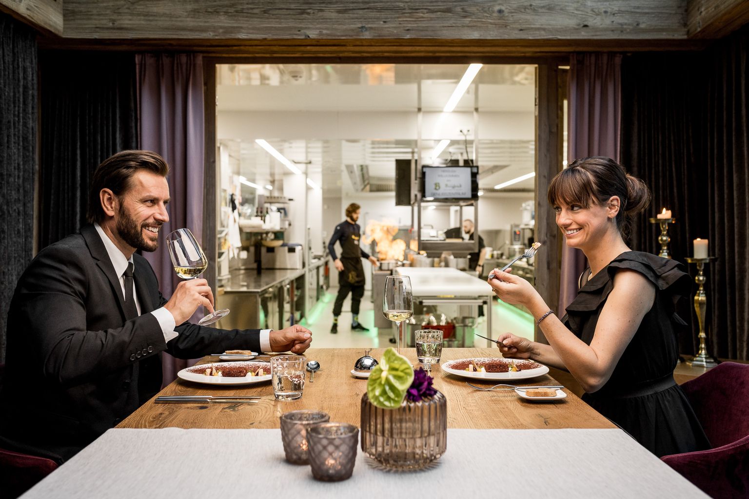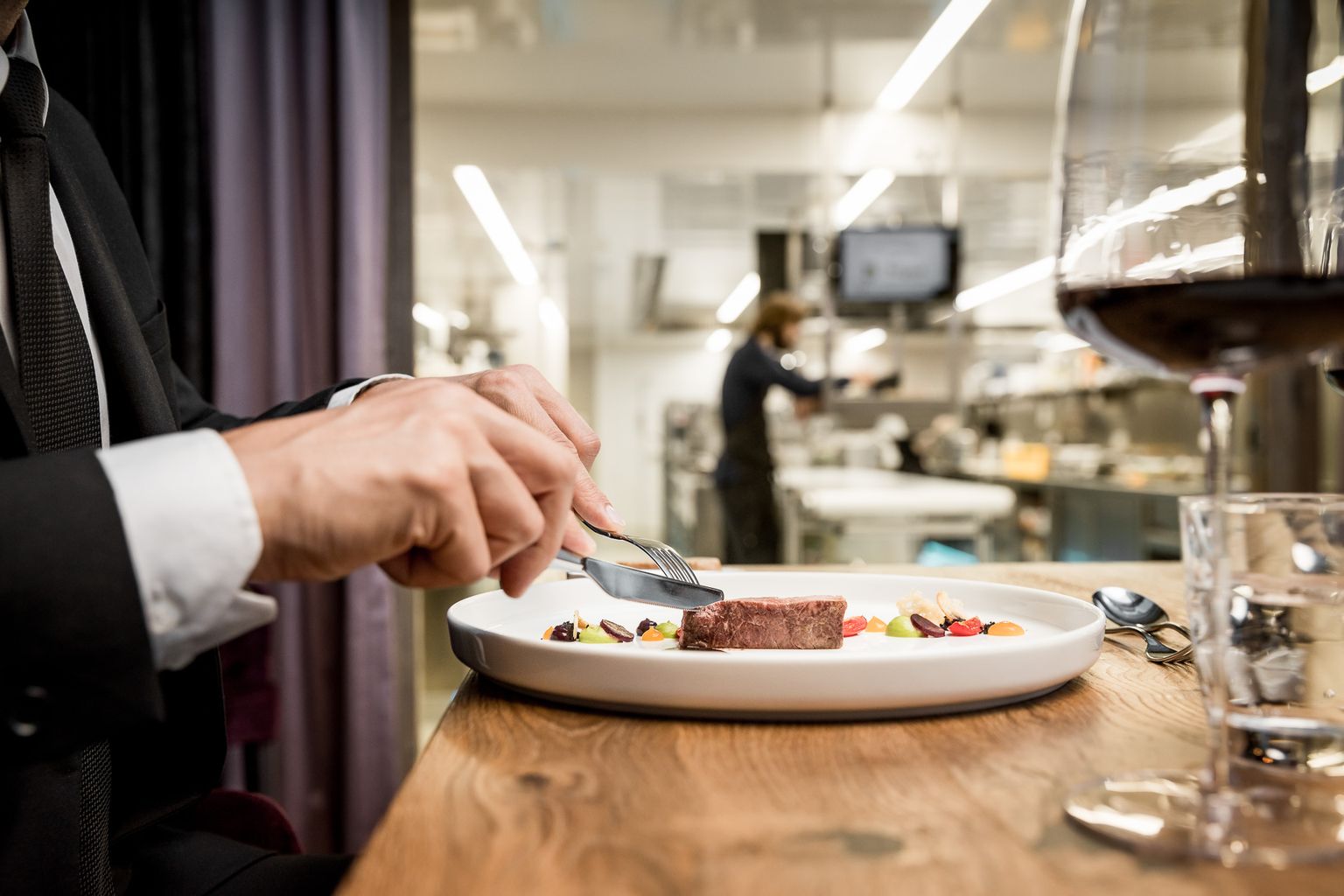 Wer auf der Suche nach DEM Chef’s-Table-Erlebnis ist, darf sich ein Menü von Sebastian Stock im Hotel Bergfried keinesfalls entgehen lassen. Durch den Abend führt Franz Stock – mit ausgezeichneten Weinen oder einer ausgewählten alkoholfreien Menübegleitung. Die musikalische Untermalung der einzelnen Gänge sorgt für besondere Stimmung. Die Grüße sind überraschend und großartig. Der Gang „Zander und Pilz“ entpuppt sich als eine grandiose Komposition aus gegartem Zanderfilet in einer geschmacksintensiven Champignon-Consommé und Champignoncreme on top. Herausragend ist der Raviolo, versteckt unter einer Parmesan-Beurre-blanc mit Trüffelspänen und Schnittlauch – Comfort Food, wie man es sich wünscht. Das Dessert: ein fruchtig-schokoladiges Kunstwerk, das vor den Augen der Gäste entsteht.