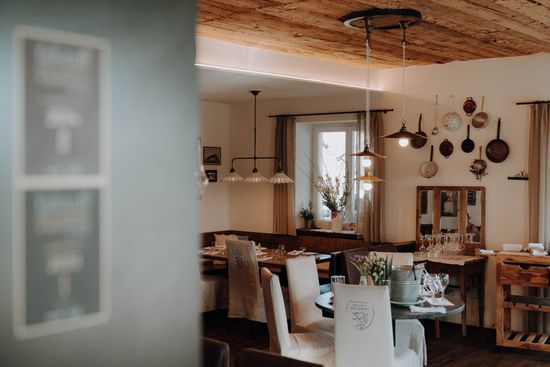 Ob zu Mittag beim À-la-carte-Angebot oder am Abend beim Menü: Mit dem Begriff „Wirtshaus“ kann man in der Blauen Traube rein speisentechnisch ebenso falsch oder eben auch richtig liegen wie bei den Bezeichnungen der Gerichte. Einmal kommt, was auf der Karte steht, und ein anderes Mal wird das „Brathuhn vom Dorffest“ beispielsweise derart auf seine grundlegenden Bestandteile reduziert, um dann als flüssige Essenz zum Einklang auf den Abend mit etwas Kräuteröl in der Bowl zu landen. Auch die Interpretation einer Forellen-Crème-brulée mit karamellisierter Hühnerhaut anstelle von Zucker oder eine unsagbar fluffige, gebackene Kalbsbries-Saltimbocca mit Speck und genialer Salbei-Hollandaise machen richtig Spaß. Man könnte noch unzählige Kreationen aufzählen, doch sollen auch „Omas süßes Muas“ und die unglaublich perfekte Tarte Tatin ihre Erwähnung finden. Es macht schon sehr viel Freude, einem derart jungen, motivierten Team bei der Arbeit zuzusehen. Der Ablauf wird hie und da ein wenig zur Show, was der Qualität der Speisen sowie der äußerst stimmigen Südtiroler Weinbegleitung jedoch keinerlei Abstriche beschert.