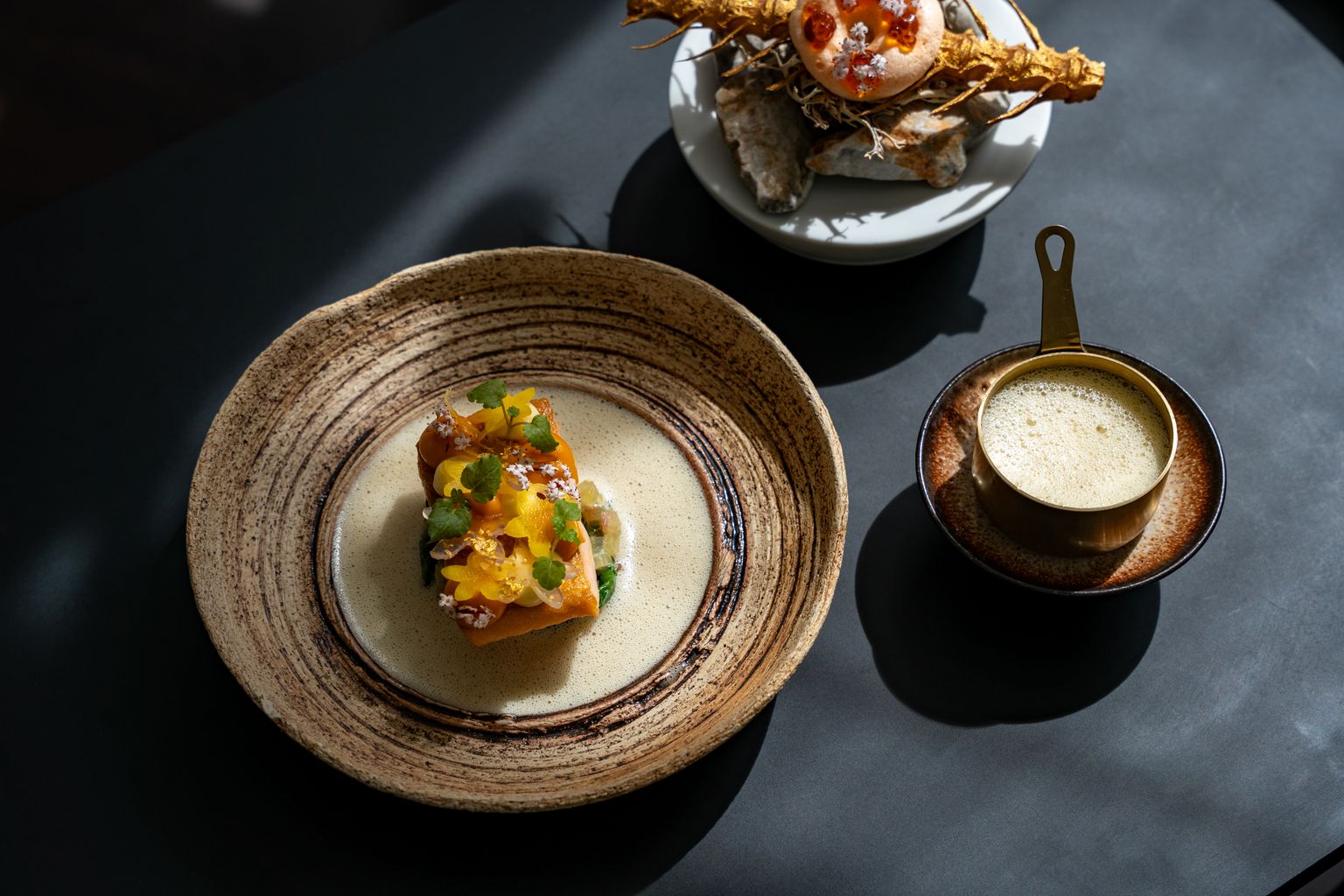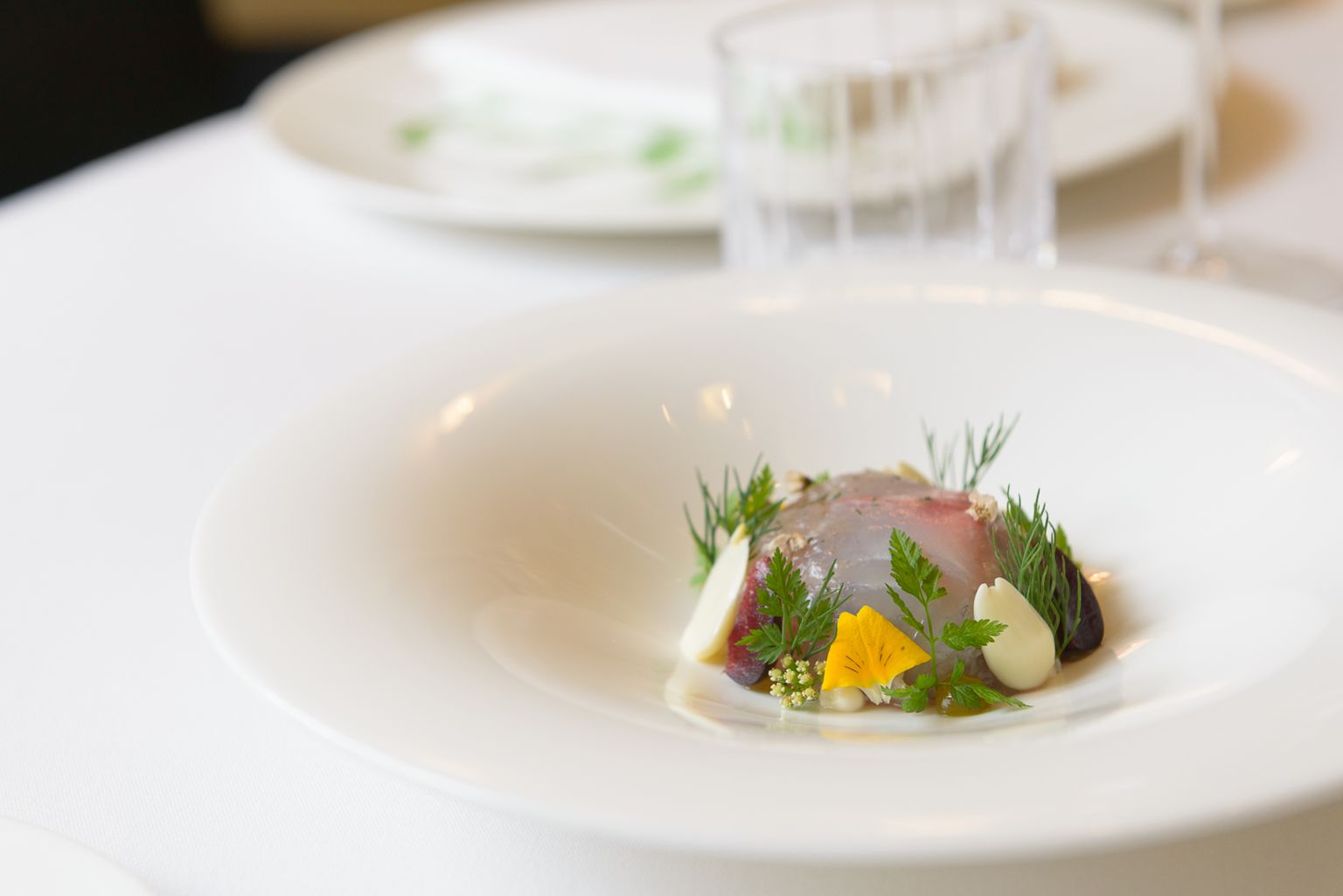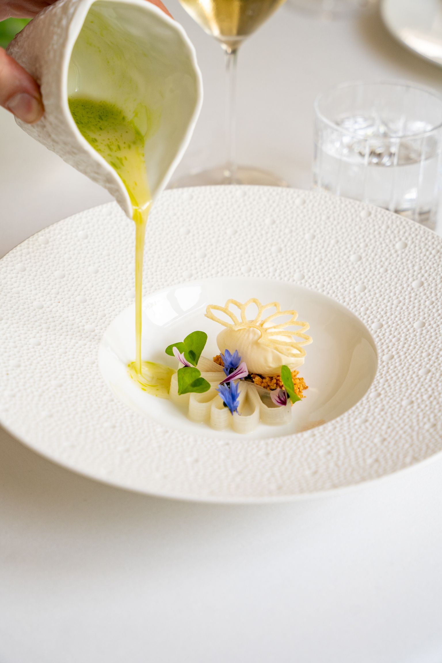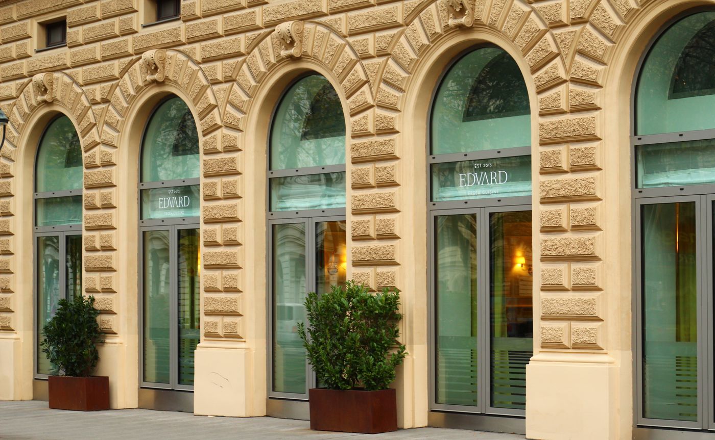 Der Waldorfsalat zum Start ist natürlich aufgelegt – Hotelrestaurant oblige – aber was da in Paul Gamaufs Küche aus dem Klassiker erwächst, zeugt von Kreativität und Könnerschaft: ein Sockel aus Granny Smith, Sellerie und Pseudogetreide, darauf eine Blüte aus transparenten Apfelscheiben, rundum ein subtil-bezaubernder Walnussschaum: Das hat eine Ästhetik, das hat Geschmack – und es hat Haltung. Im Edvard schreibt man Nachhaltigkeit groß, aber drückt sie niemandem aufs Auge. Selbst die Artischockenabschnitte werden da genusstauglich gemacht, etwa in der grandiosen Saftbegleitung, die selbst gemachte Kombuchas, Shrubs und Horchatas in atemberaubender Qualität umfasst. Das eigentliche Menü hält problemlos mit: rohe Bernsteinmakrele mit keckem Blütenbukett und Dashi, in dem Crème-fraîche-Eis aufgeht, gefolgt von einem süffigen Bärlauchraviolo mit gebackenen Artischockenblättern und Parmesansauce; schließlich Rindsfilet und Kräuterseitling in einem Jus, der ganz laut „Umami!“ ruft. Wir sagen: Wo Kunst und Wohlgefühl so innig zusammengehen, da soll man ruhig ein Stück des Wegs mitspazieren.