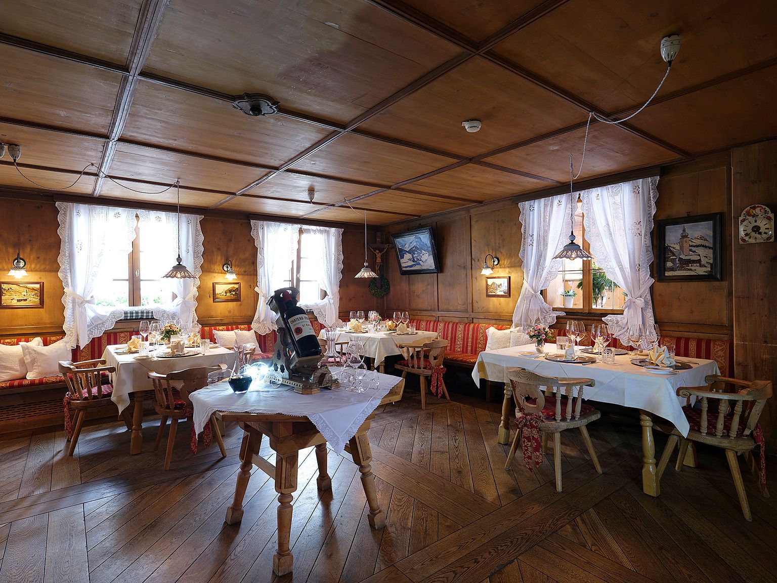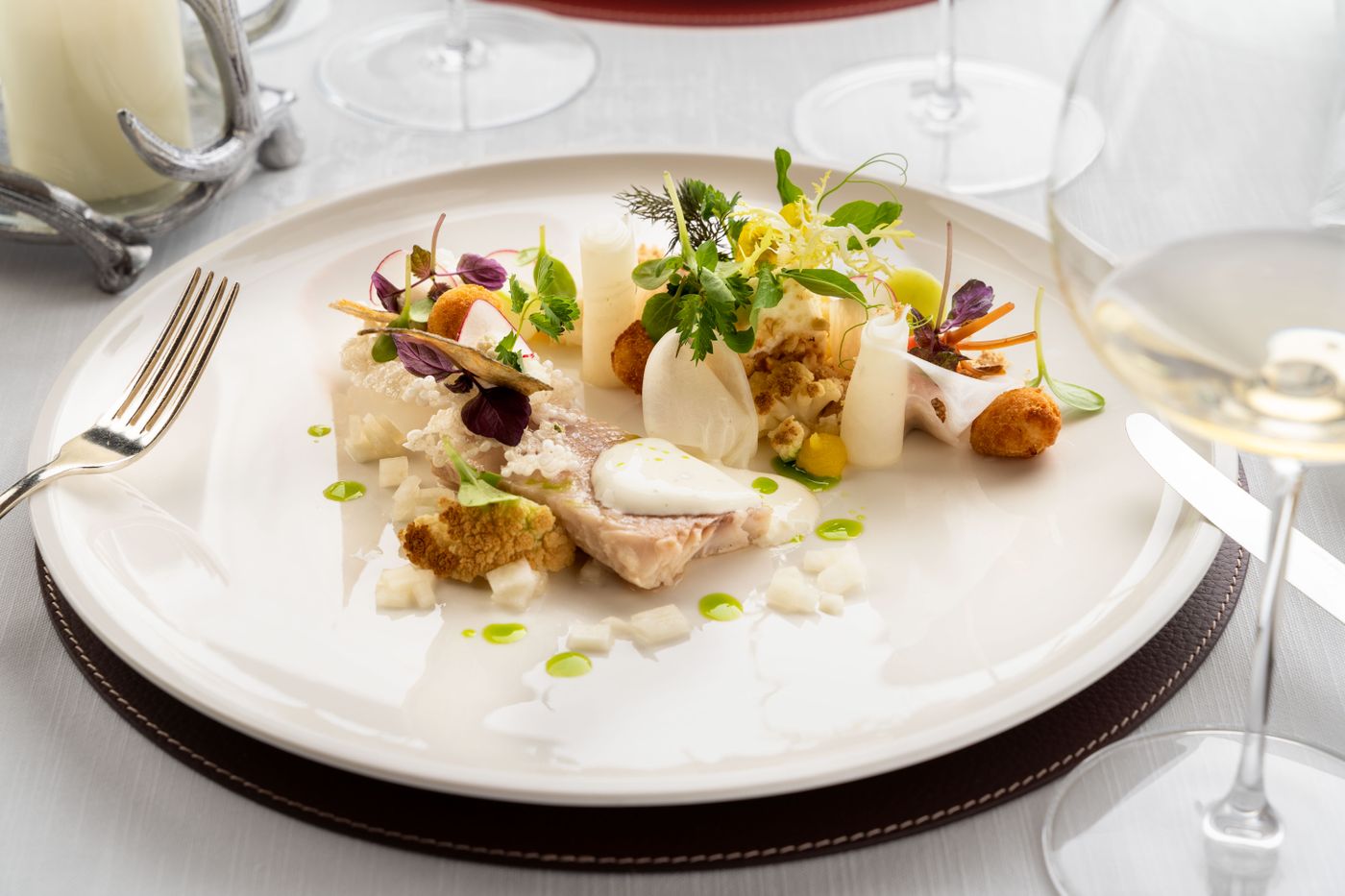 Die Hotelinstitution „Die Krone von Lech“ begeistert immer wieder mit ihrem Angebot aus „old-fashioned und modern“. Hier gibt es noch Klassiker wie Chateaubriand oder kross gebratene Ente, vor dem Gast tranchierte Fische und die legendäre Krone-Hochzeitssuppe. Als Ouvertüre werden eine veredelte Sylter Auster und ein Sauerteigbrot-Gedeck eingestellt. Die Rindsuppe mit Kalbshirnschnitte als Einlage (eine gebackene Teigtasche mit superbe gewürzter Kalbshirnfüllung) gehört in die Kategorie „Extraklasse“. Es folgt eine Salatbowl mit Miniblutwurst und Jakobsmuschel. Schön saftig gelingt auch das Rindsfilet Rossini, begleitet von einer wunderbaren Kartoffel-Mousseline. Als Dessert gibt es eine dekonstruierte Tarte Tatin und einen weiteren Schluck aus dem mit rund 1.500 Positionen großartig bestückten Weinkeller.