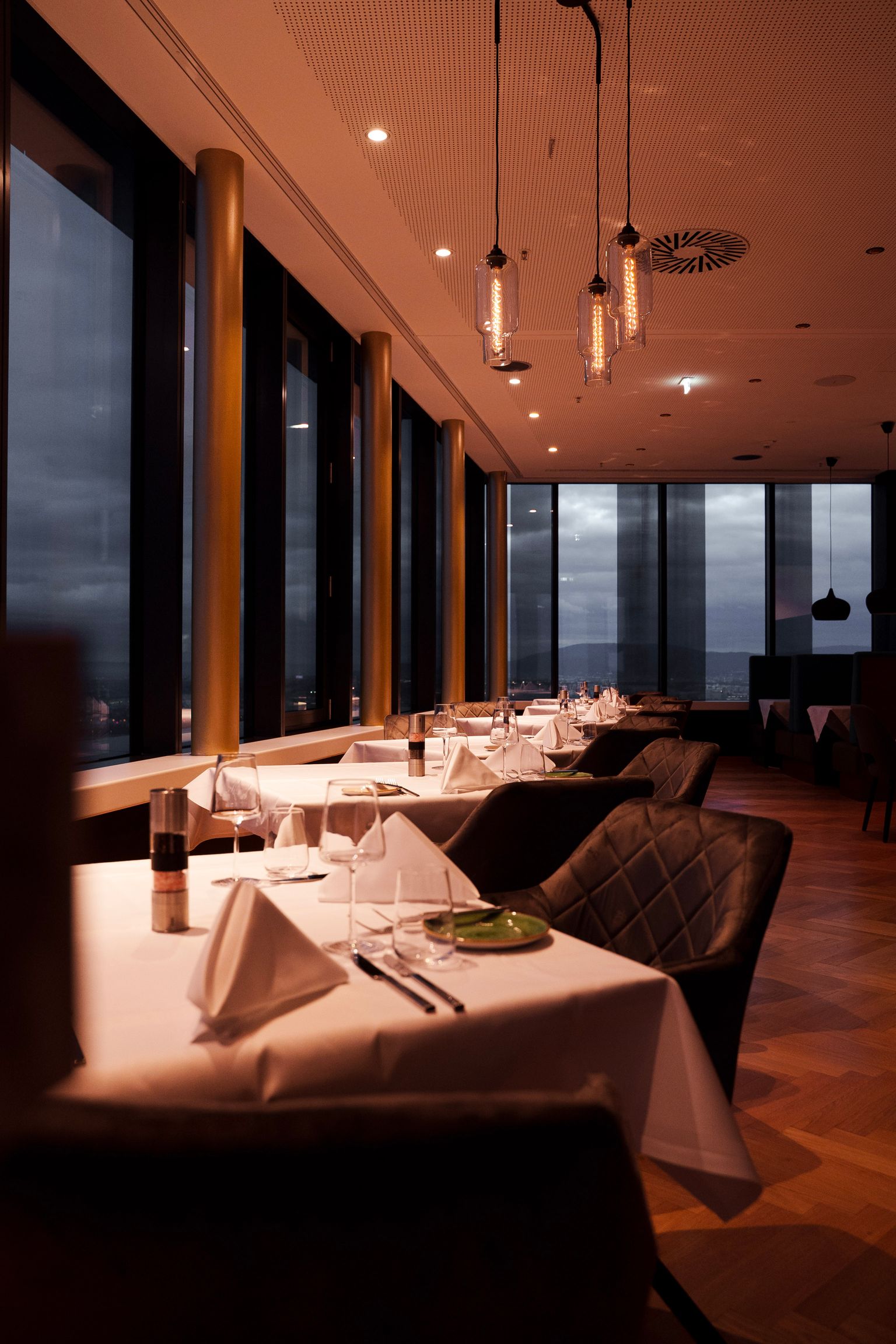 Es liegt auf der Hand – oder besser: an der Höhe –, dass man vom 22. Stock aus einiges zu sehen bekommt. Die Panoramafenster des TwentyTwo im Holiday Inn am Wienerberg geben den Blick auf die Stadt, die grünen Hügel und viel blauen Himmel frei. Ebenso facettenreich wie die Kulisse präsentiert sich die Küche, die zwischen österreichischen Klassikern (Wiener Schnitzel), levantinisch-asiatischen Ausflügen (Poké-Bowl, Hummus) und italienischen Wohlfühlgerichten (Fregola Sarda alla carbonara) changiert. Zum Abschluss lohnt ein Griff in die Pralinenbox.