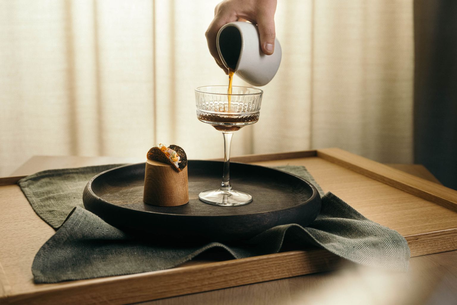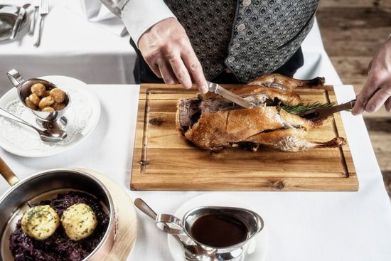 Herzlich begrüßt uns die Chefin des Hauses und platziert uns im Bistro des Hotels. Die Stube, wo normalerweise das Fine Dining stattfindet, ist an diesem Abend leider nicht geöffnet. Uns wird das Gourmet-Überraschungsmenü empfohlen und wir werden nicht enttäuscht! Bereits das Amuse-Gueule, ein Balfego-Bluefin-Thunfisch, zeigt, wohin die kulinarische Reise geht: Edle, zum Teil seltene Grundprodukte werden handwerklich nahezu perfekt auf den Teller gebracht. So ist der Glacier 51, ein schwarzer Seehecht, gefangen in antarktischen Gewässern, eine Rarität und in Kombination mit der servierten Meerestraube ein Gedicht. Es folgt eine perfekte Krustentieressenz mit einem Taco, der mit Königskrabbe gefüllt ist. Nach einem, in Geschmack und Konsistenz köstlichen Lammbries kommt der Star des Abends: ein auf den Punkt gebratener Steinbutt mit einer Trüffel-Vin-Jaune-Sauce. Der Trüffel ist vielleicht eine Spur zu dominant für den feinen Fisch. Die Yuna-Schokolade mit Imkerhonig und die anschließenden Petits Fours setzen den fulminanten Schlusspunkt und zeigen, was Patisseriekunst kann.